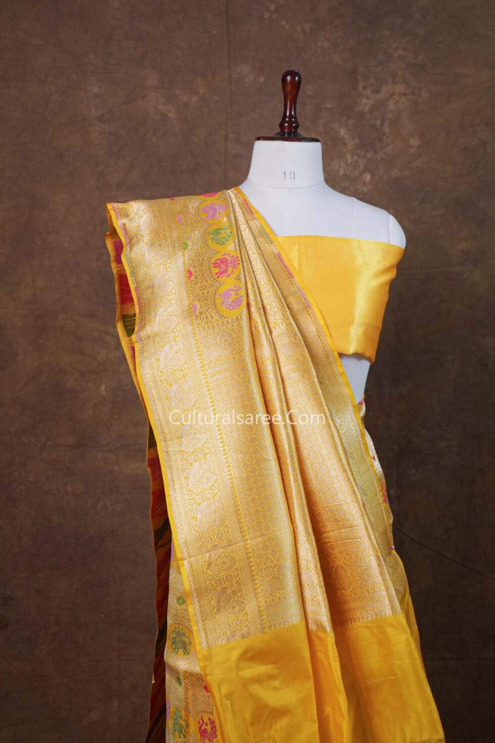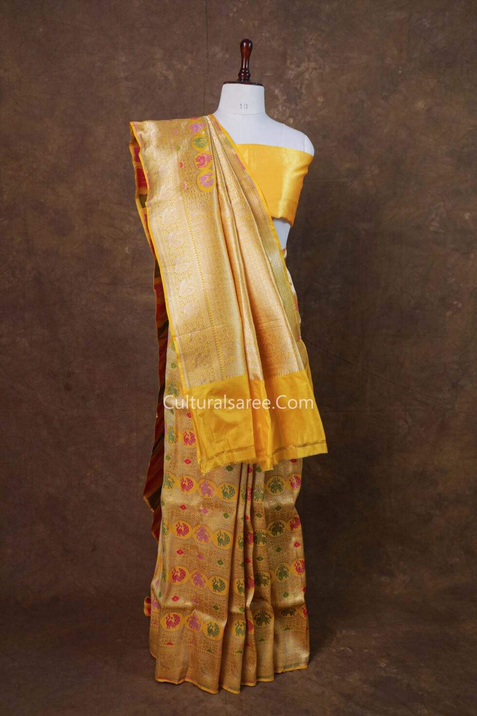 The radiant yellow base symbolizes celebration and positivity, while the luxurious pure silk fabric offers a smooth texture, graceful drape, and natural sheen. The artistic figure motifs add a distinctive charm, making this saree a statement piece for weddings, festive occasions, and traditional ceremonies. Finished with an elegant zari border and a richly woven pallu, it embodies classic Banarasi elegance.