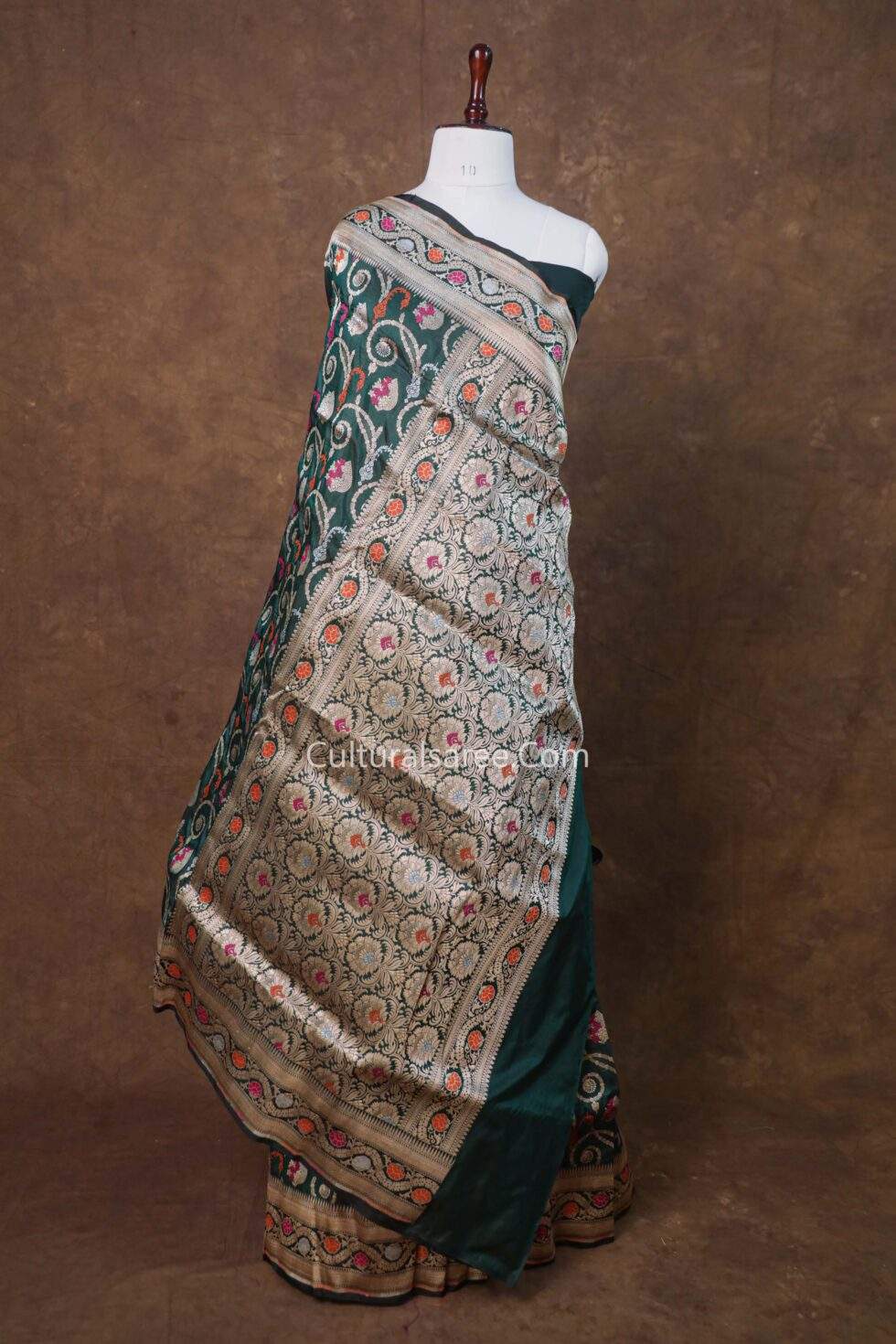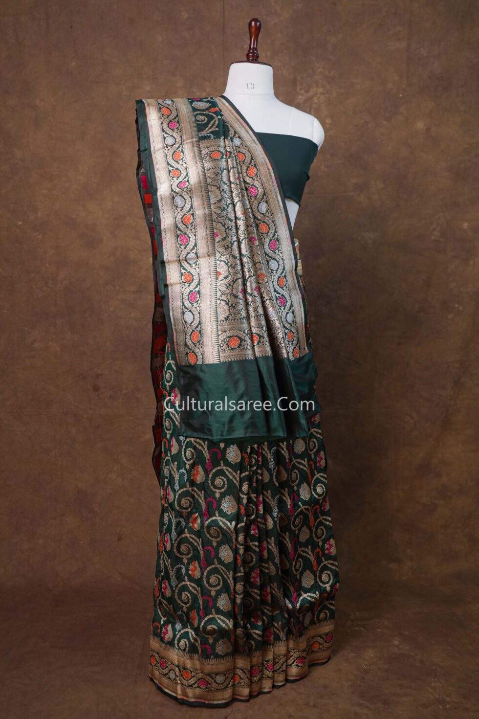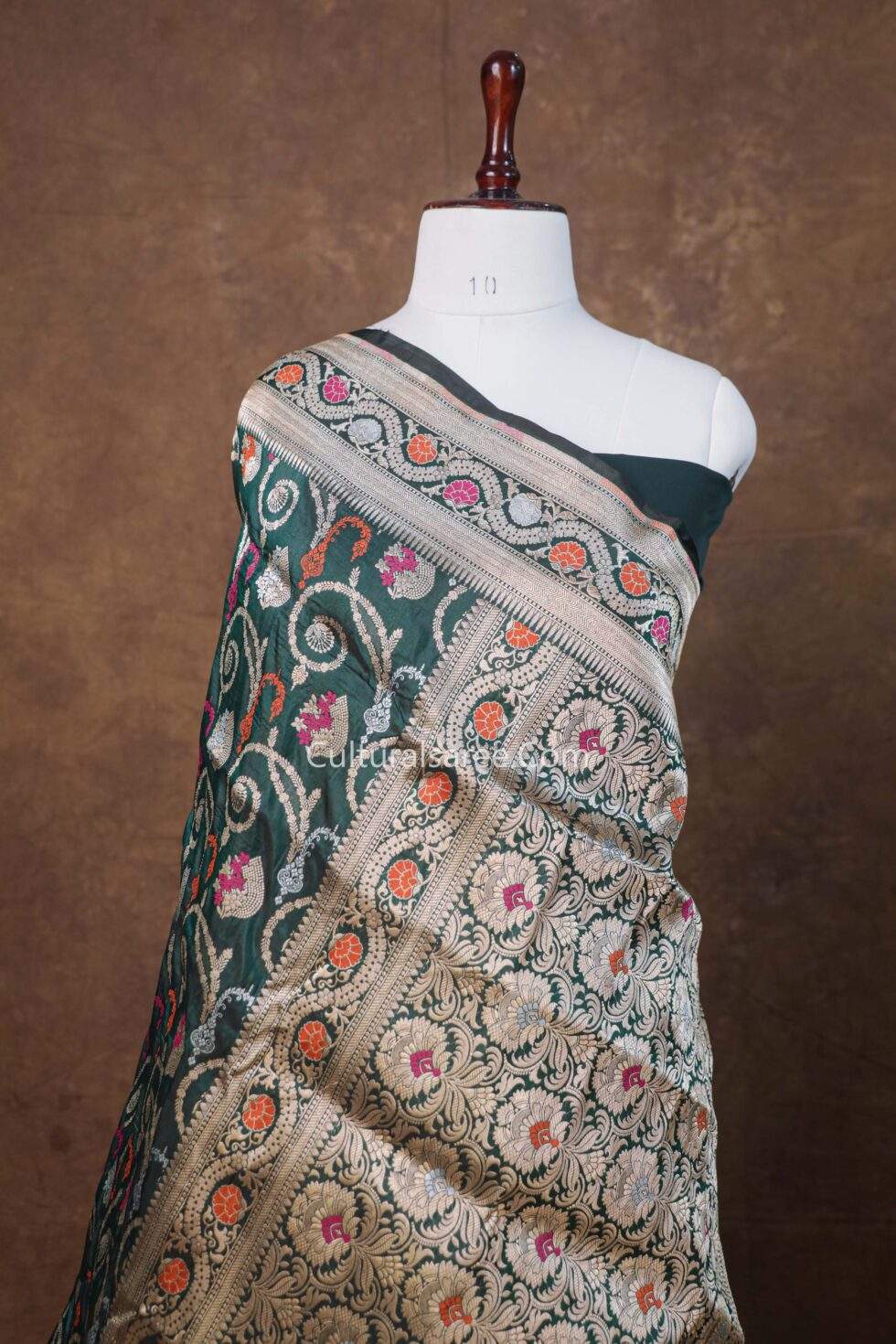 This Bottle Green Banarasi Handloom Flower Minedar Saree is a beautiful expression of traditional Banarasi craftsmanship. The body of the saree is adorned with elegant minedar floral and vine motifs, intricately woven in gold zari with subtle multicolour highlights. The flowing floral patterns create a rhythmic, all-over design that adds depth and richness to the deep bottle green base.
