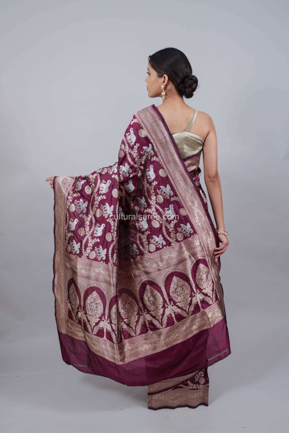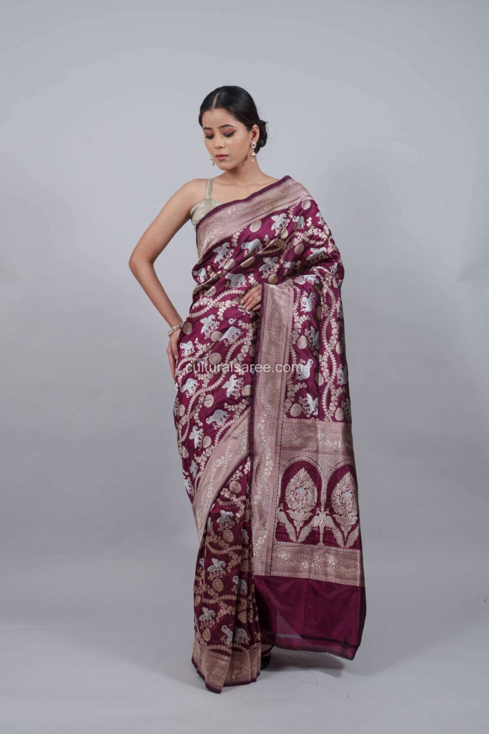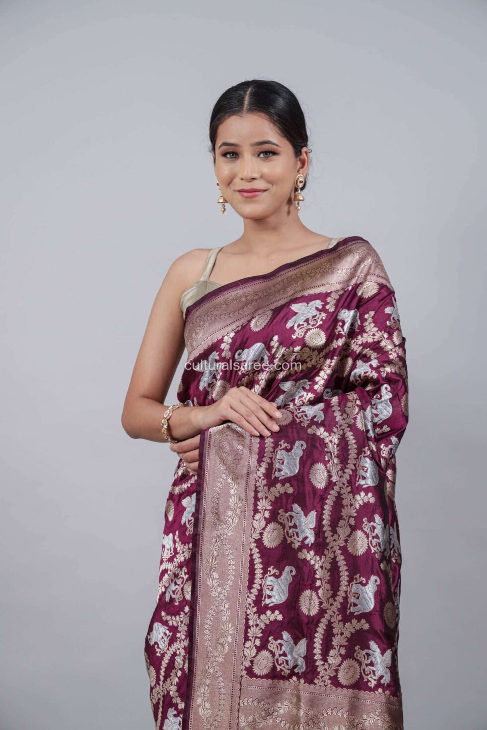 Magenta Unicorn and Elephant Motifs Shikargah Figure Banarasi Pure Silk Saree