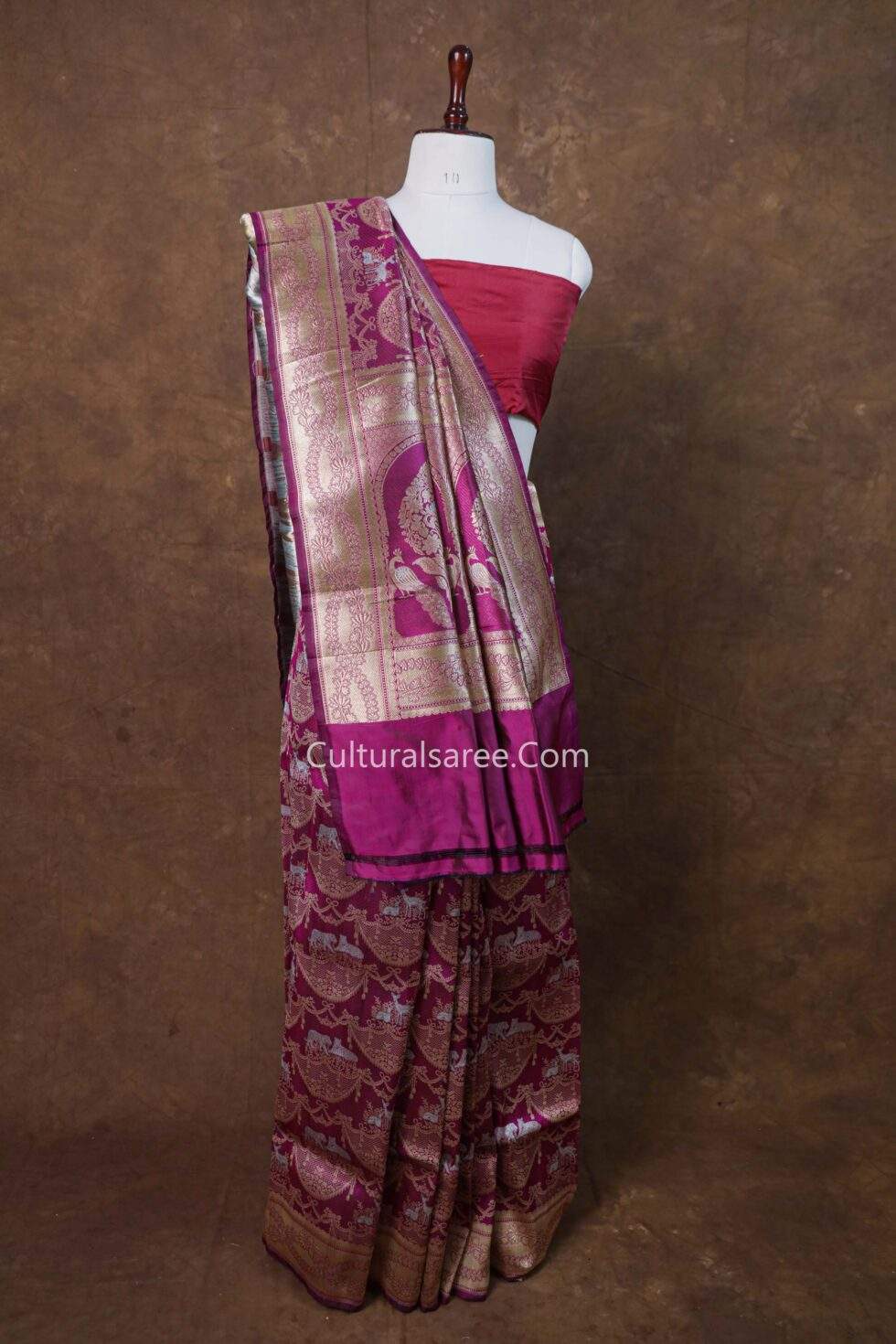 Striking and rich in symbolism, this Magenta Banarasi Handloom Deer & Tiger Figure Saree is a true showcase of traditional Banarasi artistry. Crafted from premium Banarasi pure silk, the saree features an intricate figure weave depicting deer and tiger motifs—symbols of grace, strength, and power—beautifully arranged across the body. The vibrant magenta base enhances the detailing, while fine gold zari work adds depth and regal elegance.