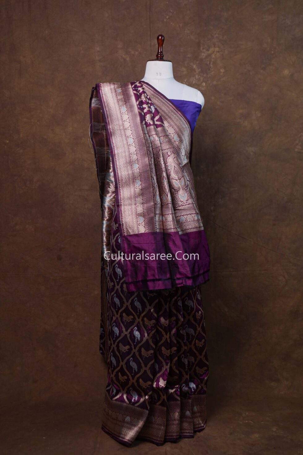 Finished with a classic Banarasi border and a finely detailed pallu, the saree offers a rich texture and a graceful drape. Perfect for weddings, festive celebrations, and traditional occasions, this saree is an heirloom-worthy piece that blends symbolic design with refined craftsmanship.