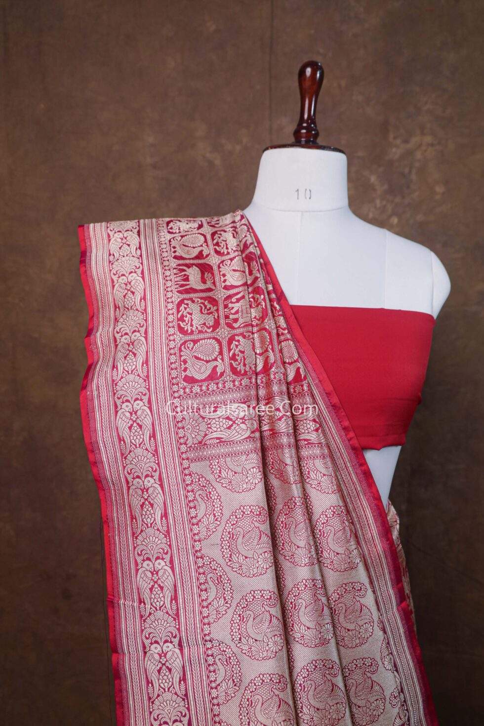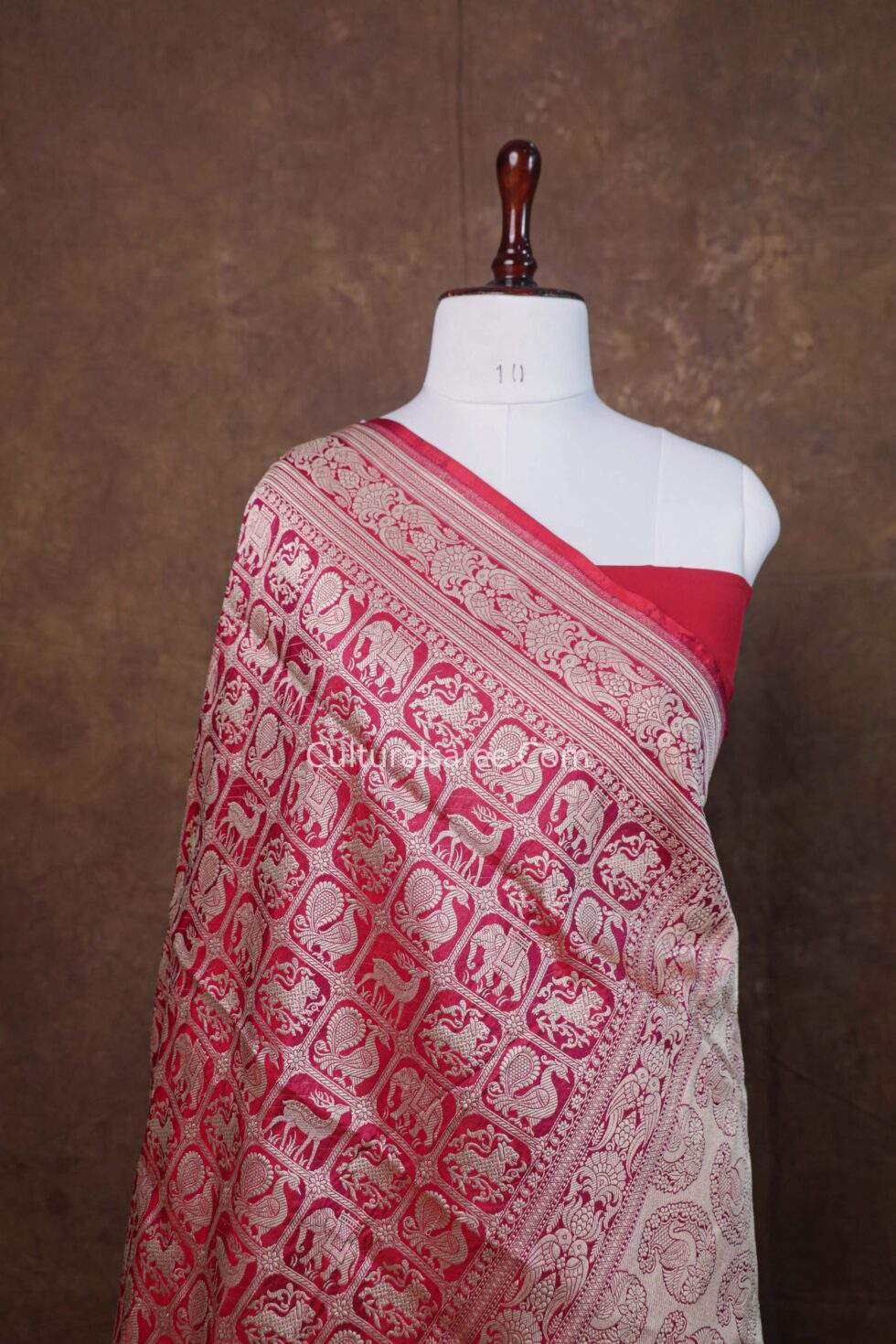 Design: The saree features intricately detailed mythical creature motifs inspired by ancient folklore and temple art, symbolizing power, protection, and divine strength. The motifs are finely rendered with rich zari work, creating depth and grandeur against the deep maroon base.