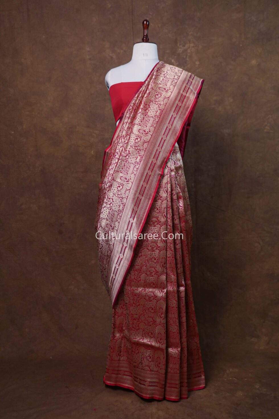 The deep maroon red hue adds a rich, auspicious charm, making it an ideal choice for weddings, festive occasions, and traditional ceremonies. Finished with a classic Banarasi border and an ornate pallu, the saree offers a smooth drape and timeless elegance.
