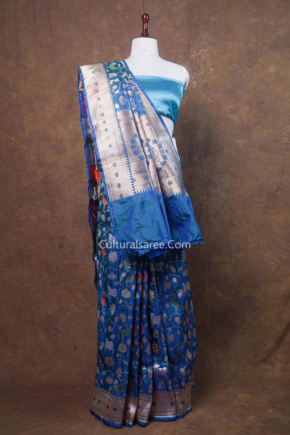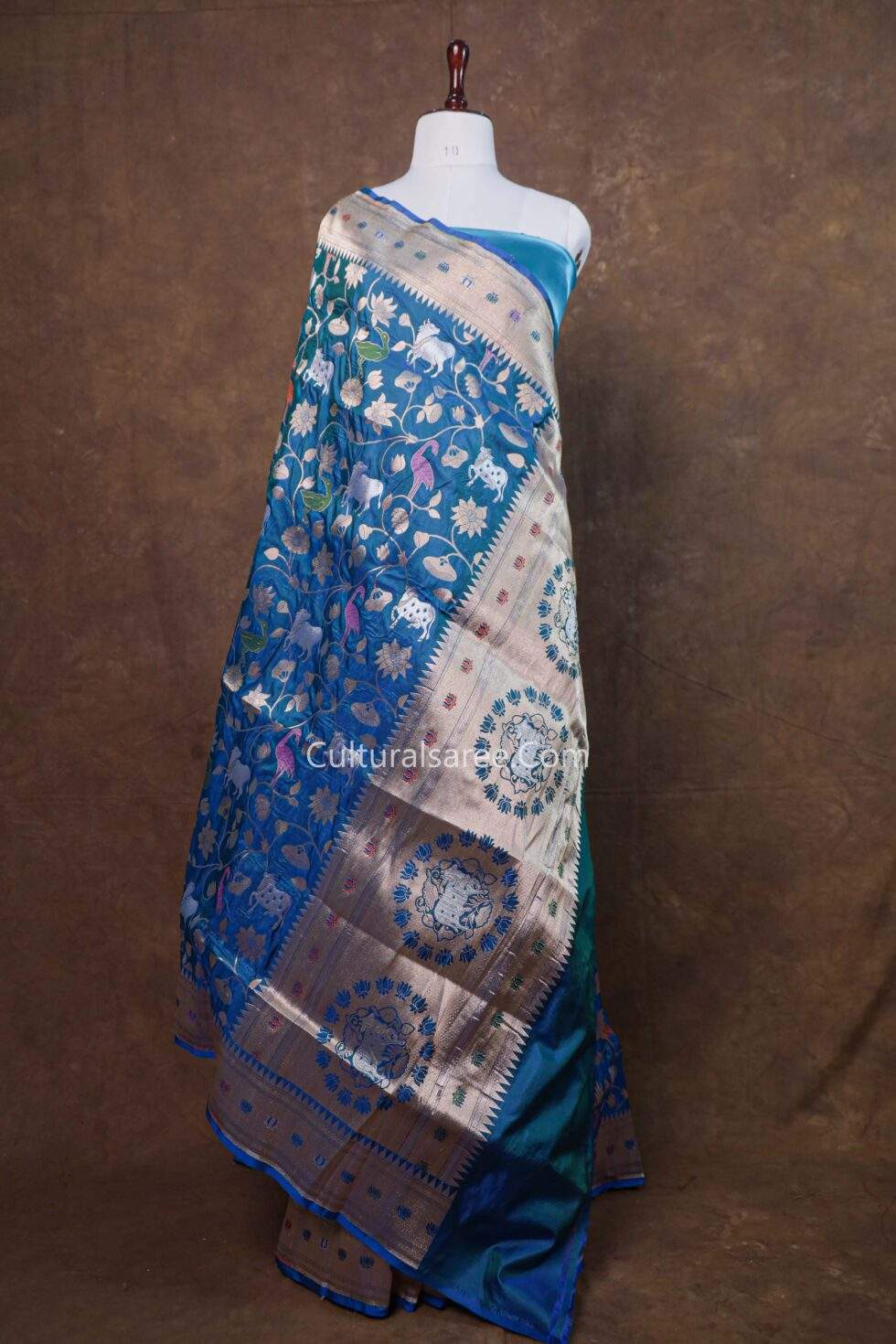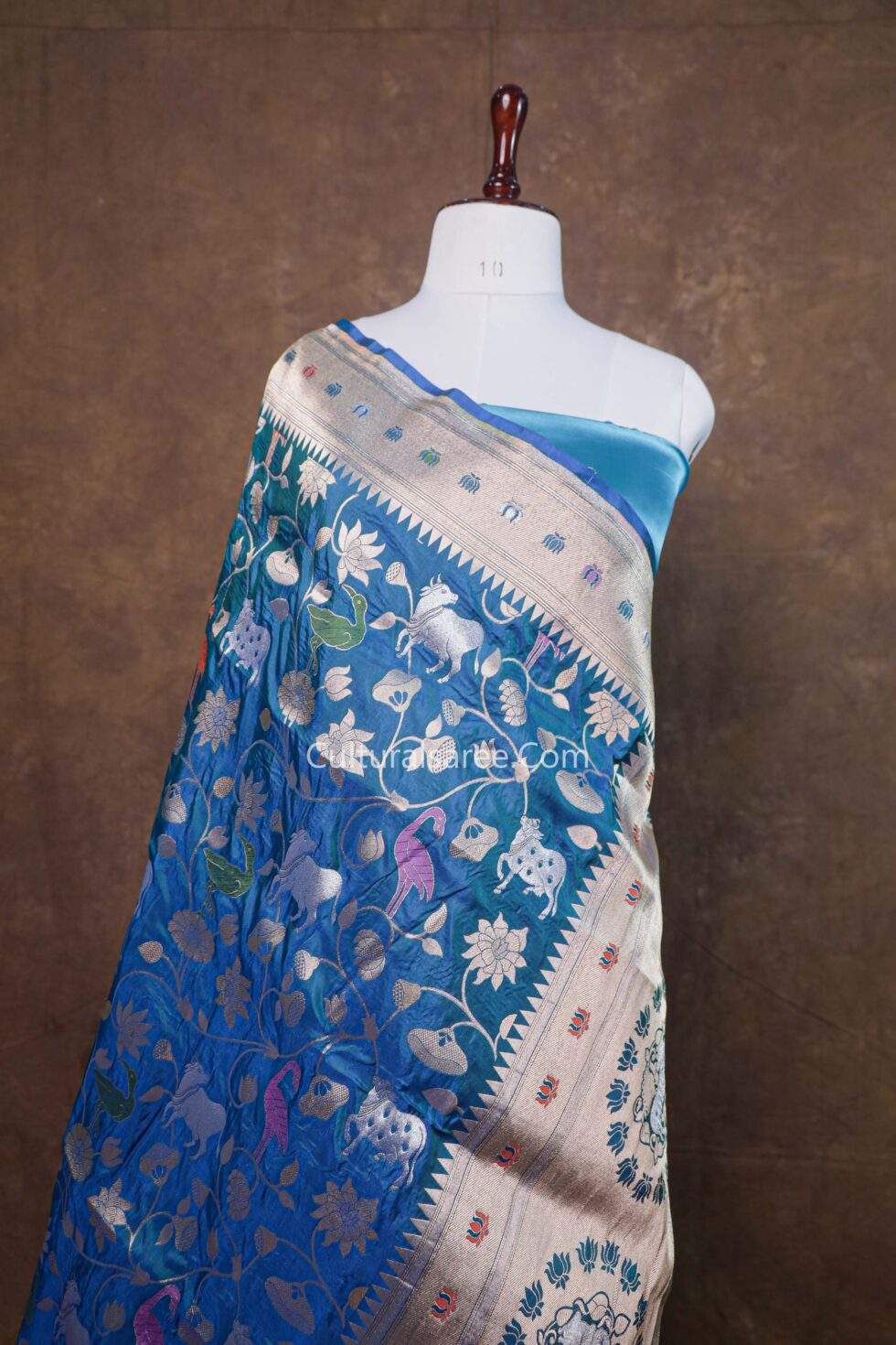 The vibrant peacock blue base enhances the depth and beauty of the detailed motifs, while the classic Banarasi border and ornate pallu add a regal finish. With its smooth texture, graceful drape, and storytelling design, this saree is an elegant choice for weddings, festive occasions, and cultural celebrations.