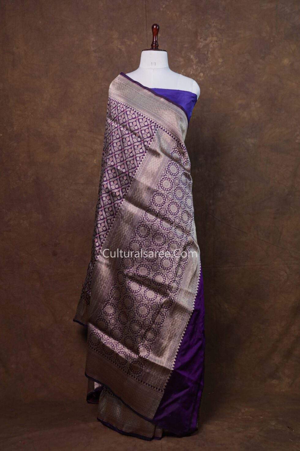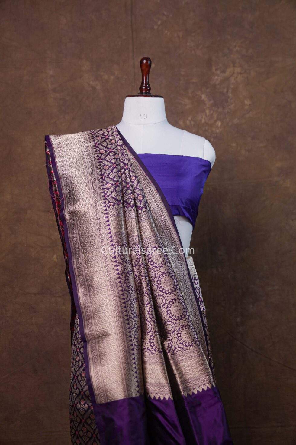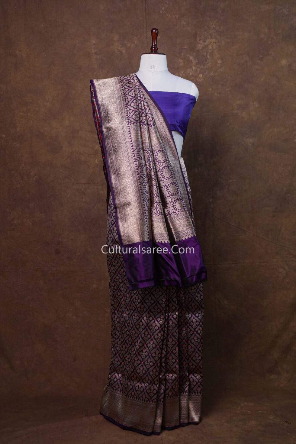 The deep purple-blue hue adds regal sophistication, beautifully complemented by a classic Banarasi border and an ornate pallu. With its rich texture, luminous finish, and elegant drape, this saree is an ideal choice for weddings, festive occasions, and grand traditional celebrations.