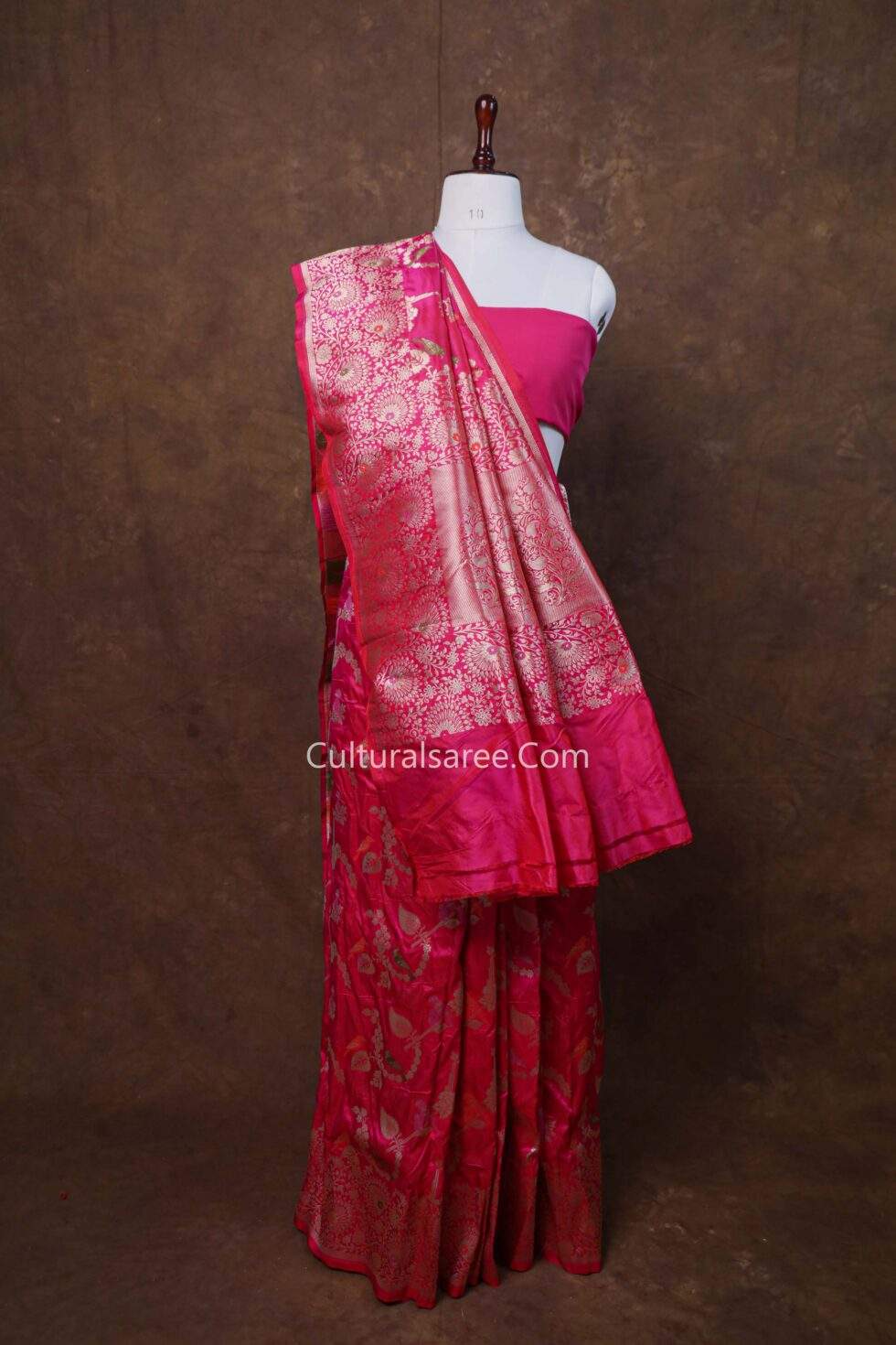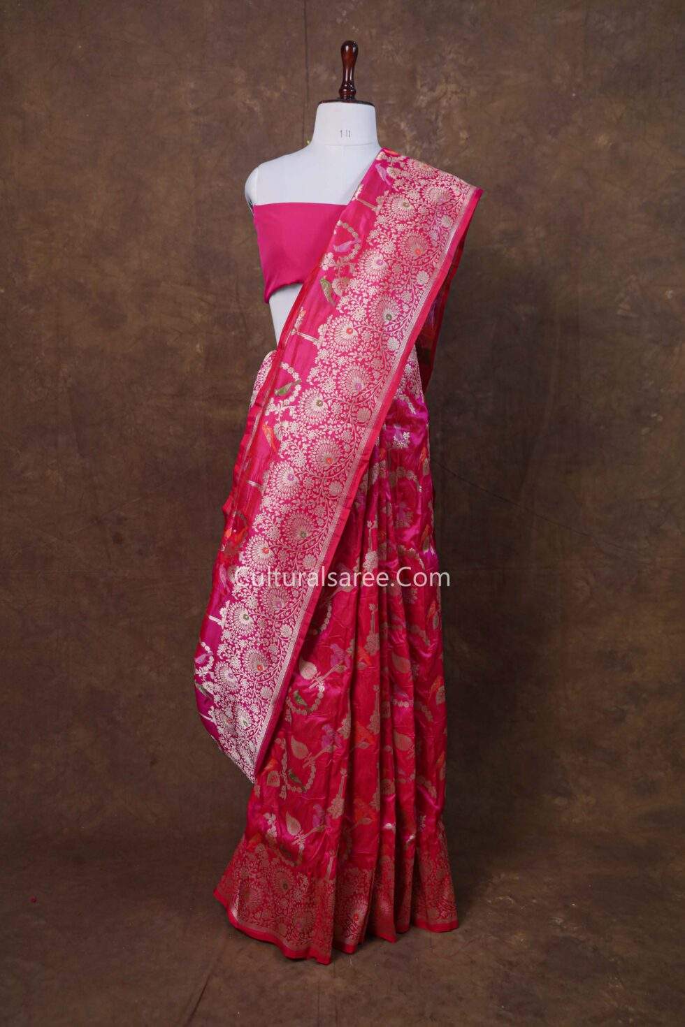 The bold rani color adds festive brilliance, while the classic Banarasi border and richly woven pallu enhance its regal charm. With its smooth texture and graceful drape, this saree is perfect for weddings, festive celebrations, and grand traditional occasions.