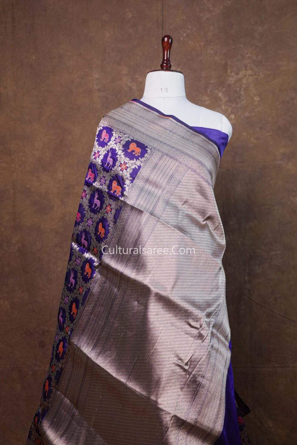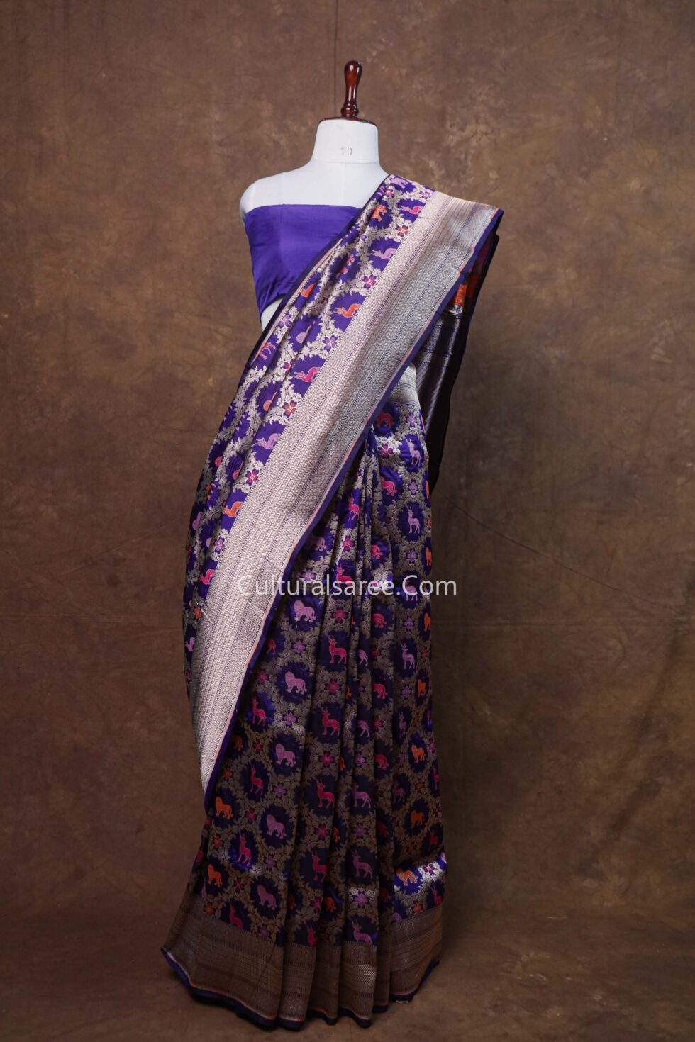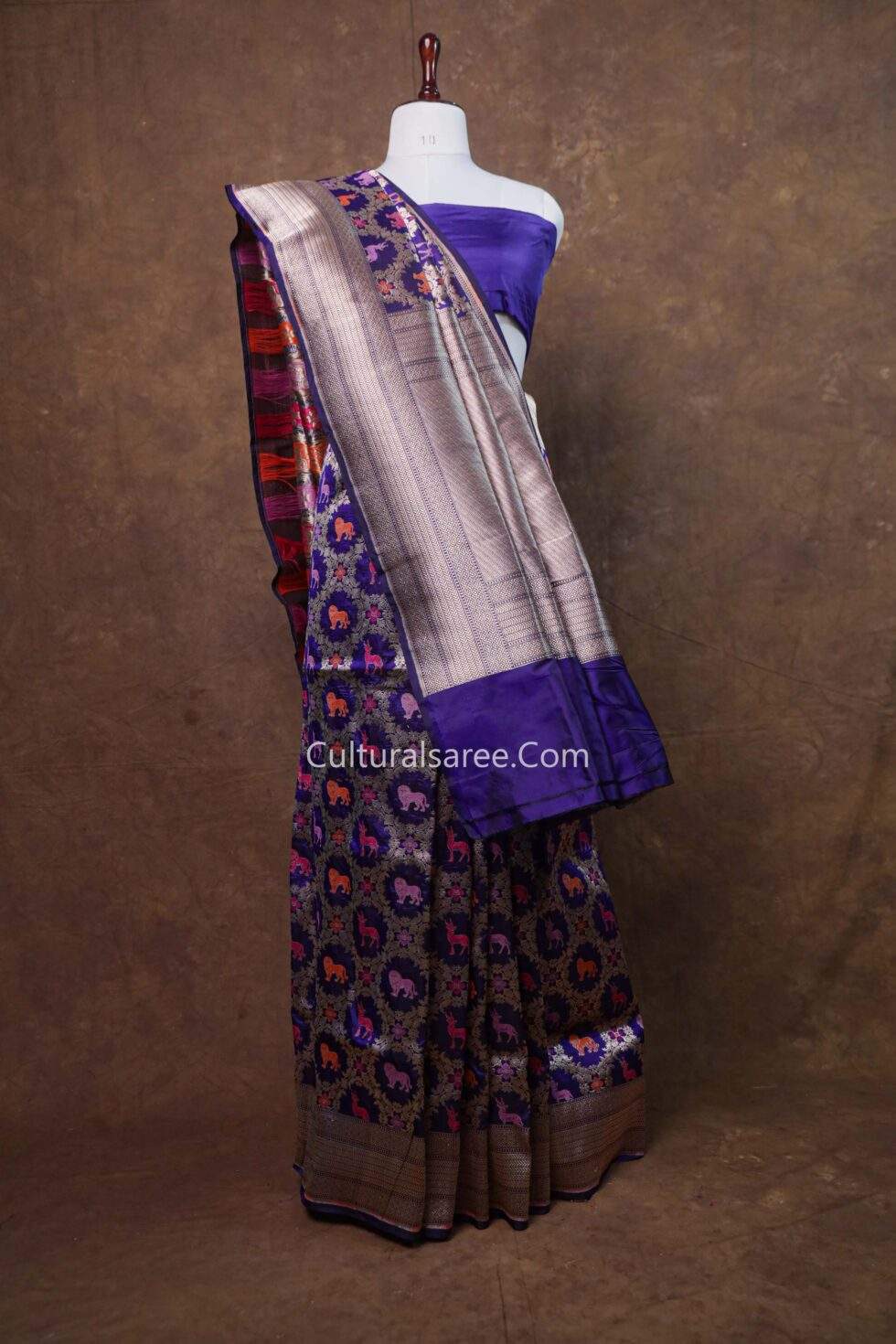Design: The saree features an elaborate Shikargah-inspired figure design with graceful animal and nature motifs, meticulously crafted using rich minedar weaving with gold and silver zari.
