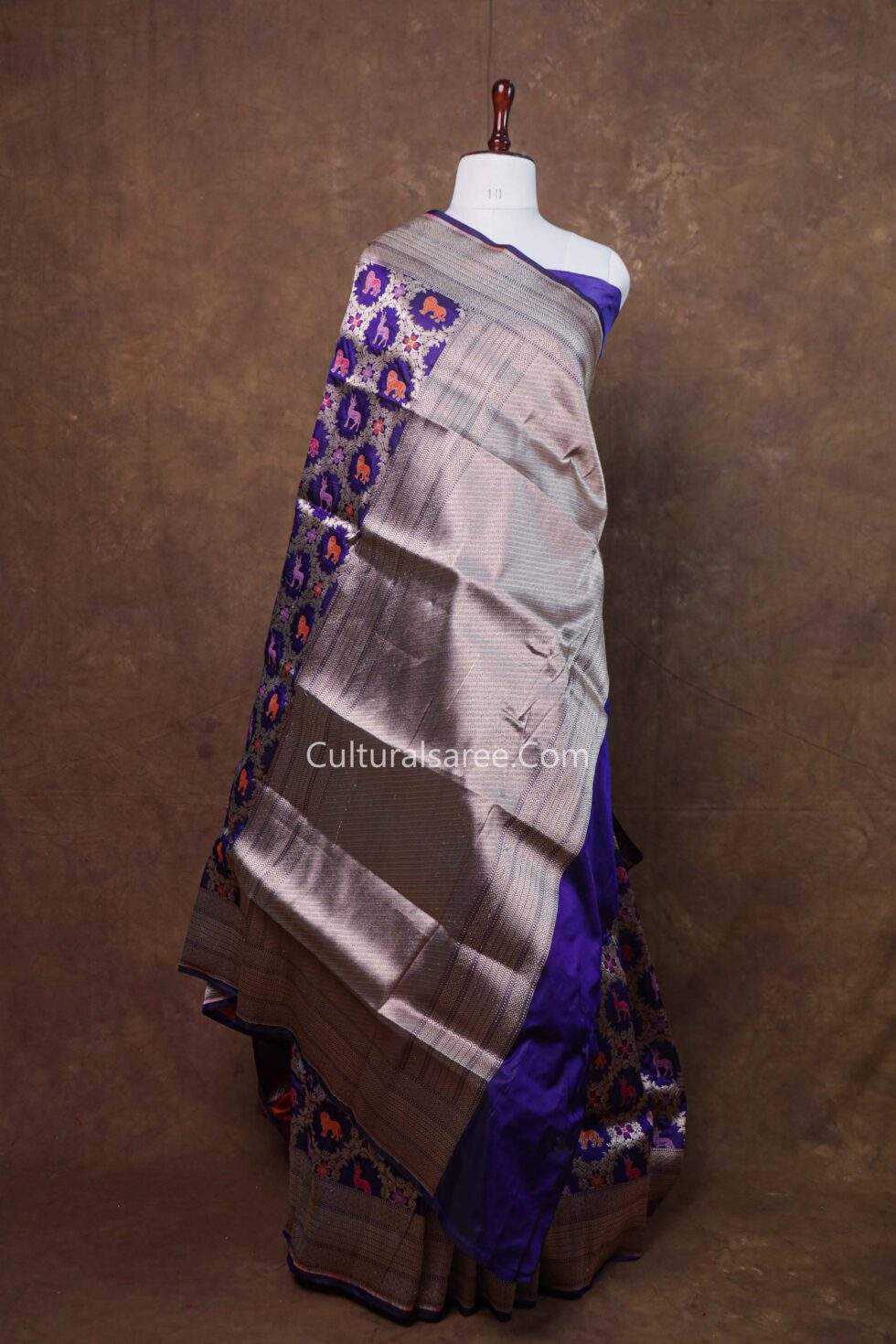 The deep royal blue base enhances the richness of the design, while the classic Banarasi border and ornate pallu complete the look with timeless elegance. With its smooth drape and heritage appeal, this saree is perfect for weddings, festive celebrations, and grand traditional occasions.