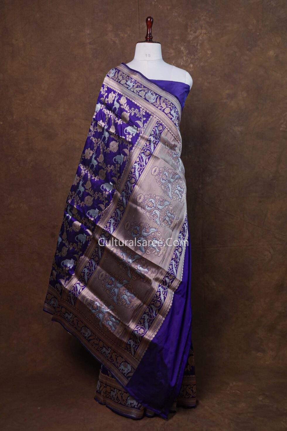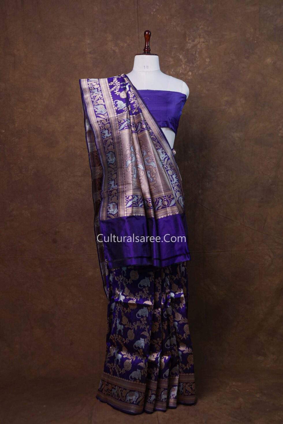 The deep royal blue base enhances the richness of the motifs, while the classic Banarasi border and ornate pallu add a timeless, ceremonial finish. With its luxurious texture and graceful drape, this saree is an ideal choice for weddings, festive occasions, and grand traditional celebrations.