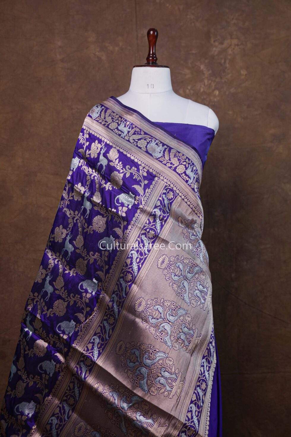 Majestic and rich in symbolism, this Royal Blue Banarasi Handloom Tiger & Deer Shikargah Figure Silk Saree is a stunning representation of classic Banarasi storytelling. Crafted from premium Banarasi pure silk, the saree features an intricate Shikargah-inspired figure weave showcasing tiger and deer motifs—symbolizing strength, balance, courage, and grace. The detailed figures are beautifully interwoven with traditional elements and highlighted using fine zari, creating depth and regal elegance.